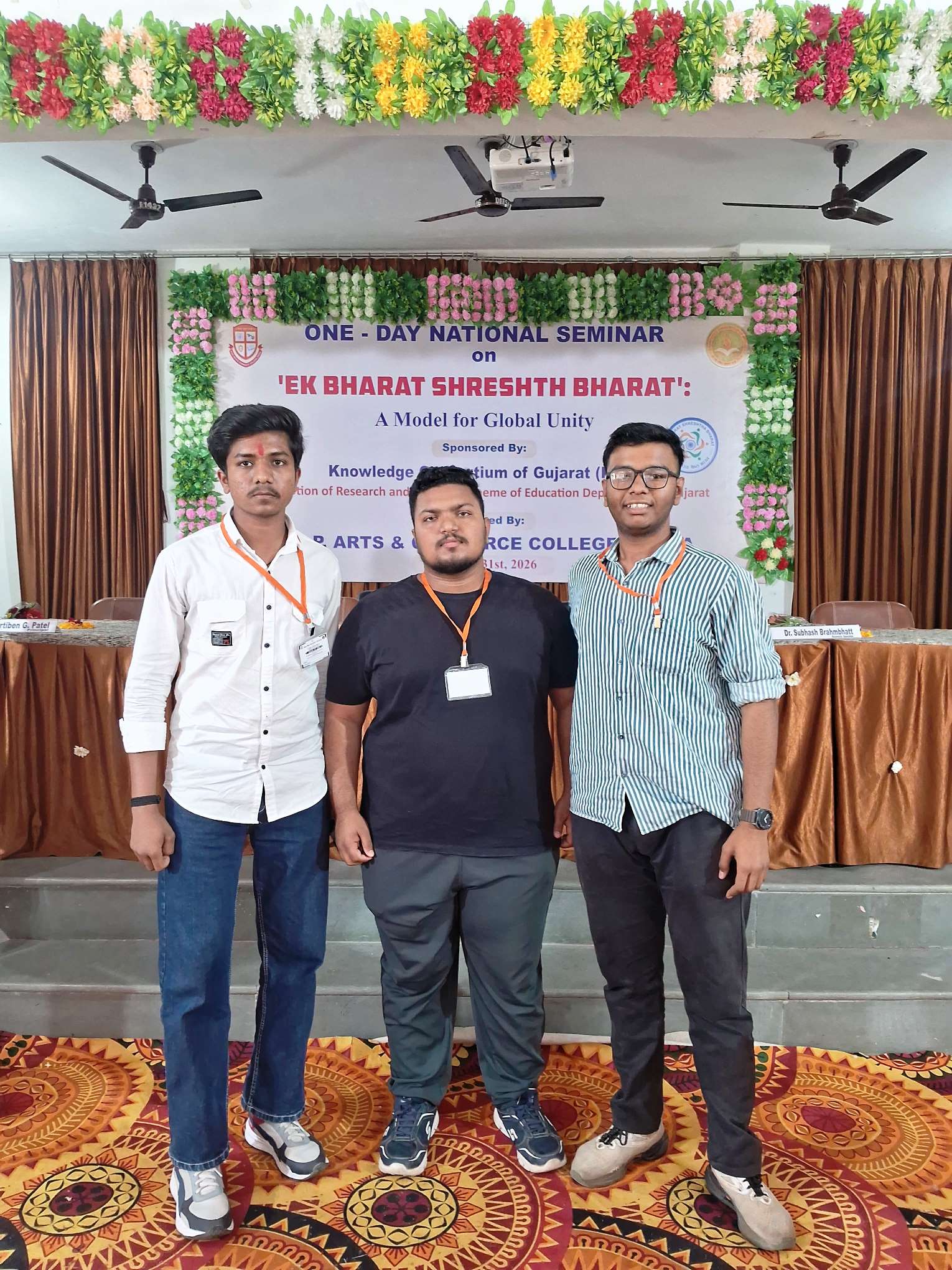 Three students of Semester 4 from the History major of M. A. Parikh Fine Arts and Arts College, Palanpur—Mayank, Tushar Bhatiya, and Kuldeep—participated in a one-day national seminar titled “Ek Bharat Shreshtha Bharat,” organized at D. A. P. Arts and Commerce College. The entire program was organized by Dr. Ashokbhai Suthar, Head of the History Department, under the guidance of the college Principal, Dr. Rameshkumar B. Patel.